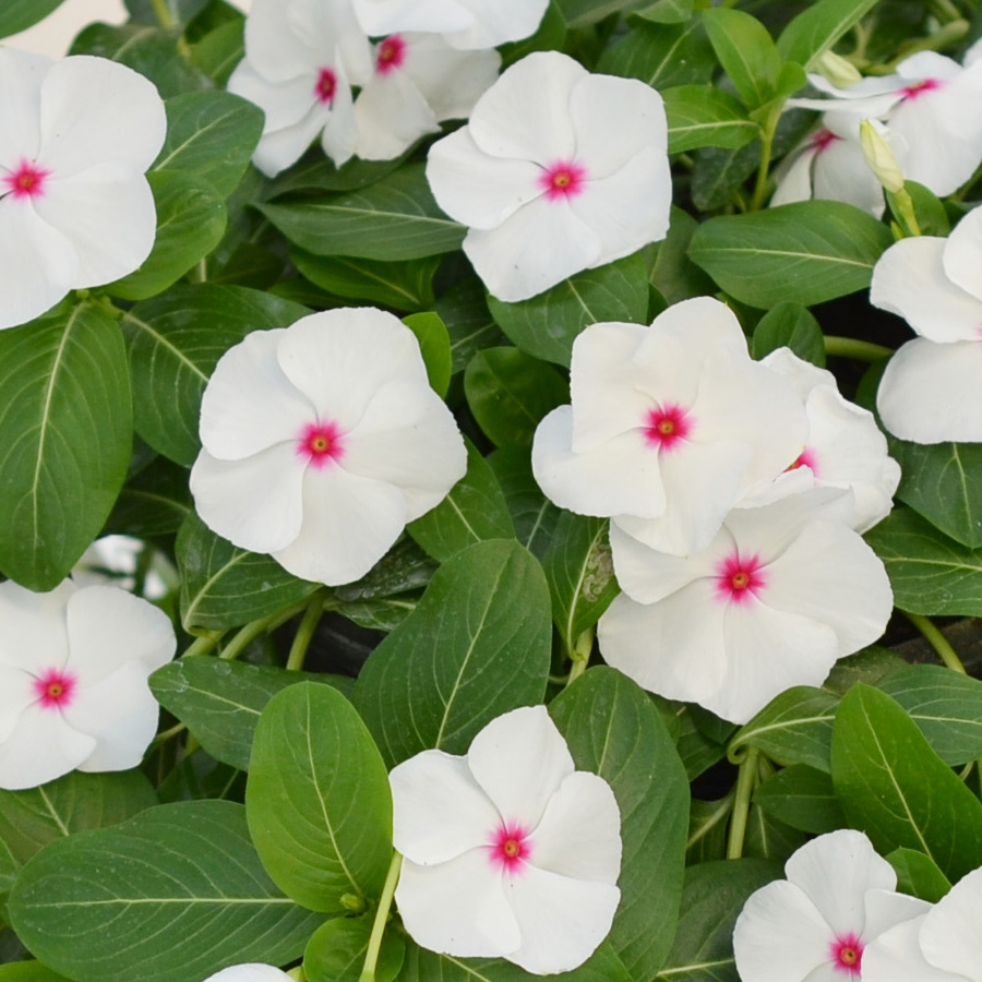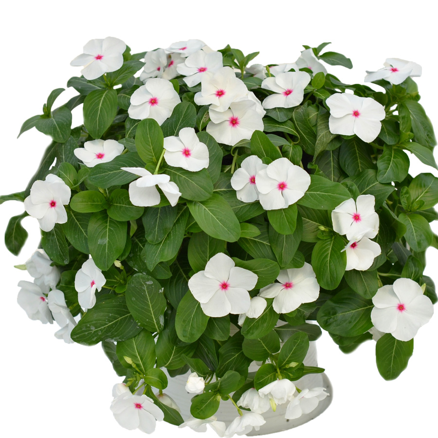 This most outstanding F1 Hybrid Trailing Vinca produces early blooms with extra-large flowers. Plants are strongly branched and vigorous with dark green foliage and the ability to self-clean. Mega Flow has high-impact blooms with overlapping petals. Its trailing habit makes it ideal for hanging baskets. Plants are exceptionally heat-tolerant.