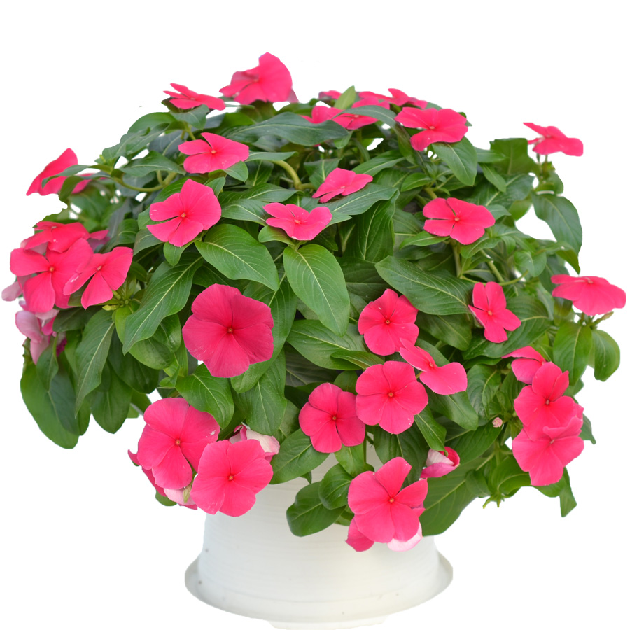 This most outstanding F1 Hybrid Trailing Vinca produces early blooms with extra-large flowers. Plants are strongly branched and vigorous with dark green foliage and the ability to self-clean. Mega Flow has high-impact blooms with overlapping petals. Its trailing habit makes it ideal for hanging baskets. Plants are exceptionally heat-tolerant.