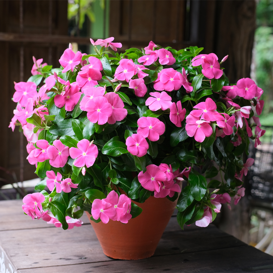 This most outstanding F1 Hybrid Trailing Vinca produces early blooms with extra-large flowers. Plants are strongly branched and vigorous with dark green foliage and the ability to self-clean. Mega Flow has high-impact blooms with overlapping petals. Its trailing habit makes it ideal for hanging baskets. Plants are exceptionally heat-tolerant.